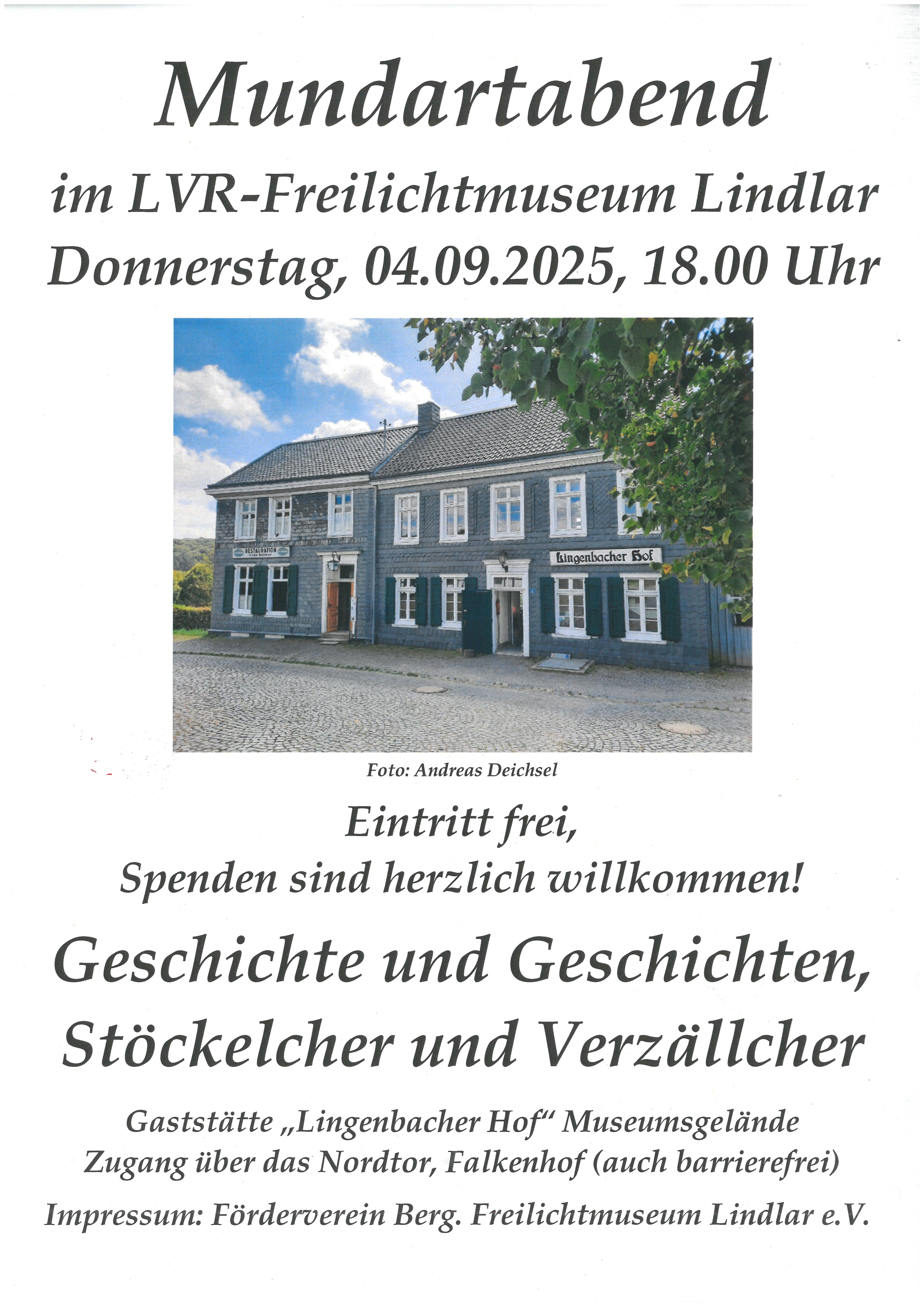 Der Eintritt ist frei, Spenden sind willkommen. Der Zugang erfolgt über das Nordtor Falkenhof des Freilichtmuseums, Lingenbach, 51789 Lindlar. Gehbehinderte können die Gaststätte anfahren.
